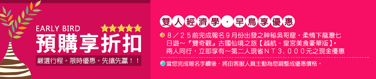 【下龍灣 VIP專屬遊船】 猶如畫舫般的遊船,倘佯於萬頃碧波之中。沿途您可欣賞一種「意境之美」,這意境很像中國國畫中的潑墨山水;潑墨畫是黑白的,但美就美在那從黑到白之間的層層疊疊。 下龍灣 和潑墨山水有異曲同工之妙,尤其 下龍灣 經常籠罩在茫茫的白霧中,尤其正午前更是如此,船行在下 龍灣 海蝕洞和海島之間 ,大小島嶼在霧氣中忽隱忽現 可見點點漁舟,時隱時現,佇立船頭,微風拂面,碧空與風帆相映,平添許多詩情畫意 ;或著,因為霧氣的緣故,眼前的一連串島嶼,顏色由深到淺層層排列。船停泊時,海面平靜無波,望著眼前的美景,訪佛身在一幅山水畫裡呢! 這裡的景色山連水,水連山,鬼斧神工,千變萬化,煙波浩渺,峰巒疊翠,令人陶醉忘情,嘆為觀止。 遊船 穿行於峰巒疊嶂之中, 海面上突出來奇形怪狀的 “ 岩石雕刻 ” 繞過九曲十八 灣 ,鬥雞島、小狗石、風帆石、香爐山、天宮洞等數不勝數的風景盡收眼底。 沿岸而建的法國式建築以及隨處可見的舢板及帆船,鄉土風情更是增色不少。 下龍灣 亦有小漁船如影相隨,可向漁民就地購買些許剛打撈而起的各種魚、蝦、蟹等美味海鮮,讓 遊船 廚工加工烹飪。 下龍灣是典型的喀斯特地形,其範圍非常廣泛,面積約有 4000 平方公里,其中散佈超過一千六百座石林及石筍狀的小島,海面上突起的奇形怪狀天然岩石雕刻,相當生動,而無數個岩洞更創造出一處令人陶醉不已的永恆世界,乘船繞行其中,體驗大自然的鬼斧神工之妙。接著帶您登陸島上一窺究竟,您會發現許多天然洞穴,驚奇洞最大者可容納三千餘人,洞內充滿鐘乳石奇景,令人嘆為觀止。午後特別於船上安排越南咖啡下午茶,讓您一邊欣賞 下龍灣 漂亮的景色一邊品嘗越南咖啡以及越式小點心,回程時您亦可在甲板上欣賞 下龍灣 的午后美景;陽光灑落倒影在下 龍灣 的海面上;微微輕得撫面吹來彷彿置身在印度支那時期的舊時風情中。