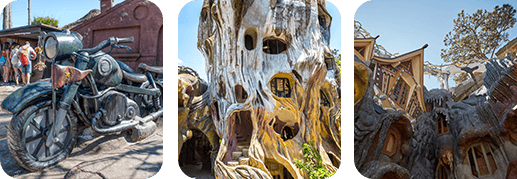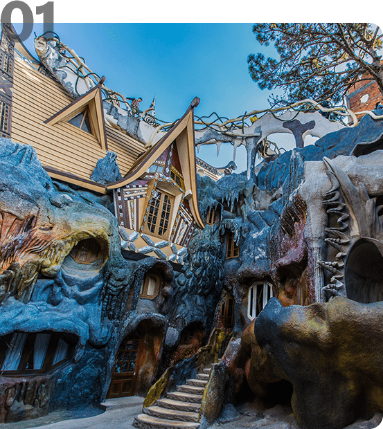 大叻山城中隱藏一處景點「瘋狂屋(Crazy House)」,被列為是世界10大最奇怪建築,猶如存在魔幻童話裡的瘋狂屋,也有人稱之為「越南版的高第建築」,也是越南大叻的奇幻地標,由建築師Đặng Việt Nga以超現實風格設計,靈感源自高第與童話世界。建築外型如魔幻樹屋,扭曲的樓梯、藤蔓狀廊道與巨型動物雕塑(蜘蛛、長頸鹿)交織,彷彿走進愛麗絲夢遊仙境。園區分為多棟相連主題屋,如「鷹巢」可俯瞰大叻全景,「蘑菇房」佈滿彩色玻璃窗,而「蜂巢隧道」則充滿探險趣味。