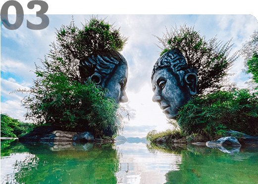 距離大叻市區約30分鐘車程,當地藝術家以在地特有紅土打造一座長達近2公里的巨人國般的「泥雕公園Clay Tunnel」,並以大叻歷史、代表地標、近代創作與最新時事分為4大主題。如最接近入口的第一主題區域,就以大叻被發現的歷史為題,隧道兩側變成高山,猴群攀在牆面好奇地向下望,羊群則站在制高點探頭探腦,旅客彷彿變成當年發現大叻山城的拓荒者般看發展變遷。 第二主題區則利用紅土復刻大叻地標,例如保大皇宮、公雞教堂、大叻車站、大叻遺產酒店等,讓旅客走完一輪,就像玩過一遍大叻般,中間穿插大型書牆或雕像,秒殺手機與相機記憶體。 位於隧道盡頭的第三主題區是最受遊客喜愛的區域:無極湖~湖景緻迷人,湖中央設有兩尊互相對望的巨大人像。值得一提的是,這裡湖水碧綠清澈,湖邊被濃密的松林包圍,營造出一片浪漫、夢幻,毫不遜於歐洲的美麗景色,近年經過社群媒體分享後更一炮而紅,現在更必須要排隊才能拍照。在一旁也有許多結合現在創意與童話發想的泥雕或混合不同媒材的雕塑,讓旅客可以盡情拍照取景。 近年才慢慢發展出來的第四主題區與第一主題區遙遙相望,以花卉、現代飛機、還有影響全球的新冠肺炎為主題設計,最醒目的就是巨大針頭刺向病毒的雕塑,隱含全球一起對抗病毒的過去。