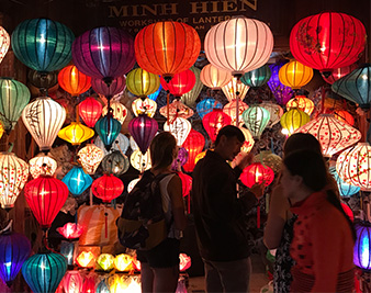 到了傍晚會安古城成了燈籠的世界,或明或暗的燈光透過各色的燈籠,折射出一種朦朧的美,把這座古城妝扮得更加迷人而富有生機。