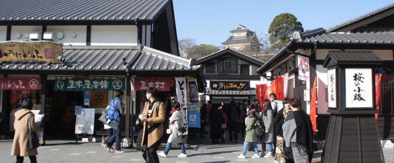 熊本城下的「櫻之馬場城彩苑」,於2011年才落成便成為了熊本的聞名新地標,由熊本城步行數分鐘即可到達。位於其中的「櫻之小路」商店街滿是熊本縣的名物手信,例如馬肉專門店、特色工藝品等等…樣樣俱全。