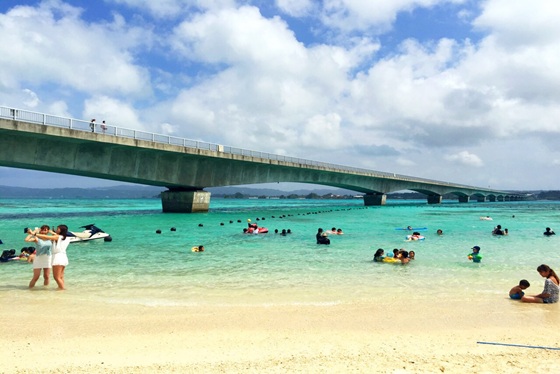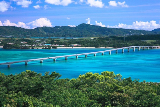 【古宇利大橋】傳說中古宇利島是琉球人的神聖之島。連接古宇利島與屋我地島,一般道路中稱之為日本最長的橋。連接今歸仁村的古宇利島和名護市的屋我地島,全長2,020m(主橋梁1,960m,延伸60m)的橋,日本最長的橋。這裡的藍天特別藍、白雲特別白、碧綠的海水特別碧綠,配上優美的大橋,真是沖繩的必看美景!