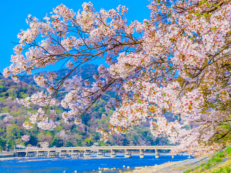 【京都嵐山渡月橋】渡月橋乃昔日山天皇因皓月橫空啟發而命名,如今是電影時代劇的熱門景地,橫跨大堰川的渡月橋,自古即有許多詩歌為之傳頌,此地的秋色與冬景常是騷人墨客最好的題材,有著濃郁之傳說色彩,漫步悠遊,令人心曠神怡,站在渡月橋上觀賞滿山白色的山櫻景致,好似覆雪的山。續往嵯峨野竹林步道欣賞竹林之美,沿路二旁的竹木高聳,靜幽詩情,閑靜中盡是畫意。