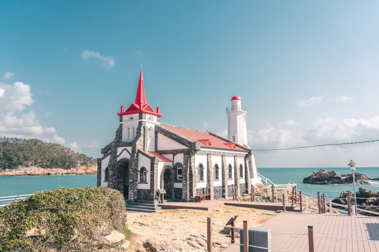 是位於小漁村的地理特性,使其形成了與眾不同的氛圍,彷彿將中世紀某座海濱村莊原封不動搬來,整座聖堂與周邊風景如畫一般美麗。打在岩石上的白色碎浪與聖堂的紅色屋頂形成鮮明對比,一下子便吸引了訪客們的目光。竹城聖堂中最多人排隊等候之處,便是如同架好相框般的拍照區,相框中的藍色大海和天空形成了絕美的背景。