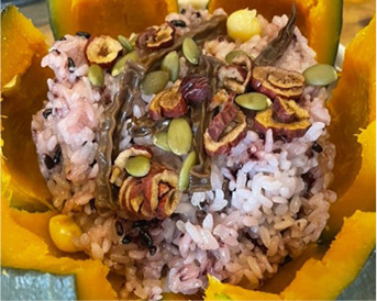搭配的主食是極具特色的南瓜營養飯。整個南瓜被挖空,內部填滿了糯米、紅棗、栗子、核桃等多種堅果和穀物,再一同蒸熟。南瓜的香甜滲透到每一粒米飯中,口感軟糯,味道清甜,不僅營養豐富,也為這道餐點增添了獨特的風味。 這套煙燻鴨肉搭配南瓜營養飯的組合,不僅美味,也兼顧了健康與養生,讓您在優雅的環境中,享受一頓充滿慶州特色的高級韓式料理。