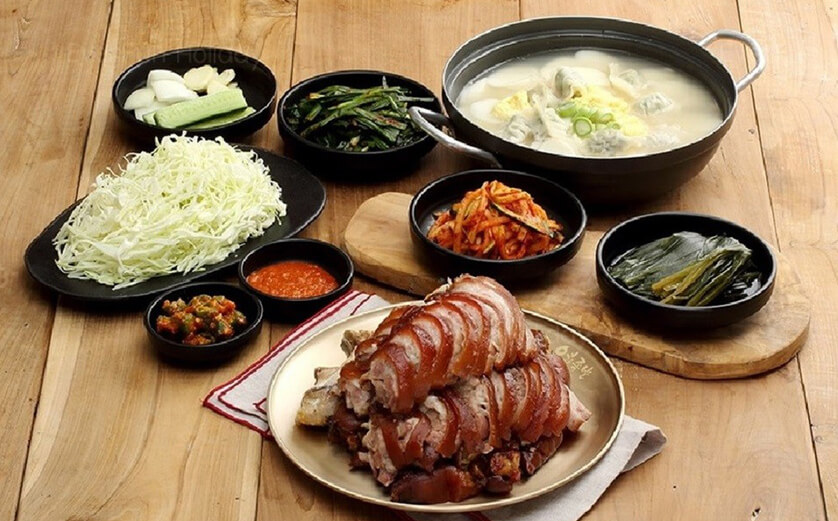 是首爾當地非常有名的美食,以其獨特的香氣與軟 Q 口感而聞名。豬腳經過長時間的燉煮,將肥肉部分的油膩感去除,只留下軟嫩的膠質,口感彈牙,充滿了香醇的滷汁風味。搭配切成薄片的蒜片、新鮮生菜和特製醬料一起享用,更能襯托出豬腳的美味,清爽解膩。