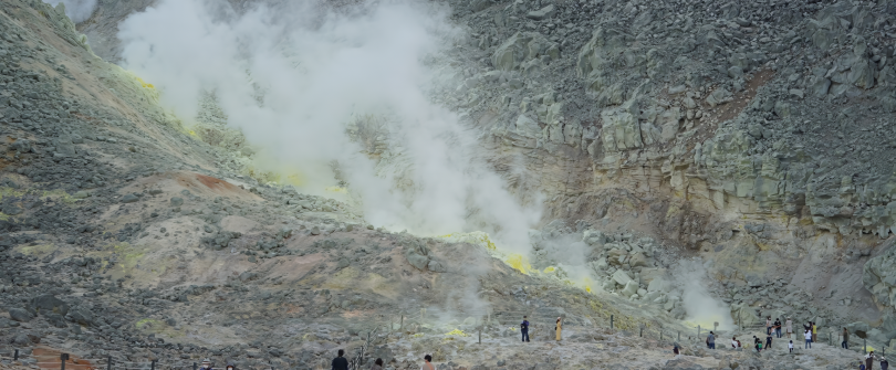 「硫磺山」是海拔512公尺的活火山,也有「裸山」一名,山腰上有無數的噴氣孔,冒著含有硫磺的白煙, 空氣中瀰漫著硫磺的味道猶如奇幻電影的場景,也讓不少熱愛火山地貌的遊客趨之若鶩,令人印象深刻。