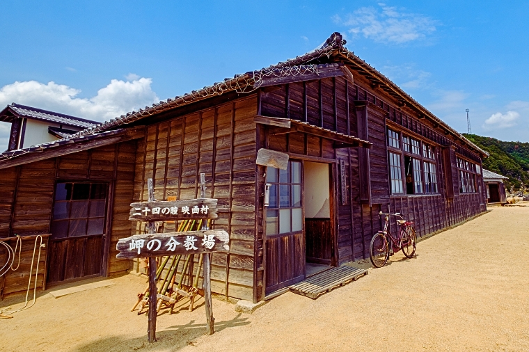 二十四瞳電影村是以電影『二十四之瞳』背景道具改建而成,呈現大正・昭和初期的村落景象,兼具日本電影與文學氣息的主題樂園。 『二十四之瞳』是部描述昭和3年至戰後翌年間的動盪時代,新任女教師與12位孩童間的師生愛小說,由小豆島出身的作家—壺井榮撰寫而成。 進入村內散發出昭和氛圍的木造校舍,令人懷舊。