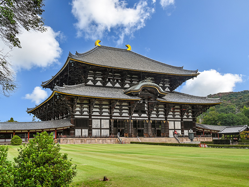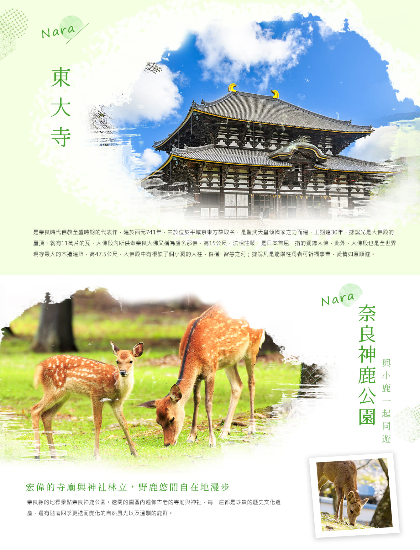【奈良東大寺(入內參觀)是奈良時代佛教全盛時期的代表作,建於西元741年,由於位於平城京東方故取名,是聖武天皇傾國家之力而建,工期達30年,據說光是大佛殿的屋頂,就有11萬片的瓦,大佛殿內所供奉奈良大佛又稱為盧舍那佛,高15公尺,法相莊嚴,是日本首屈一指的銅鑄大佛,此外,大佛殿也是全世界現存最大的木造建築,高47.5公尺,大佛殿中有根缺了個小洞的大柱,俗稱─智慧之河;據說凡是能鑽柱洞者可祈福事業,愛情如願順遂。