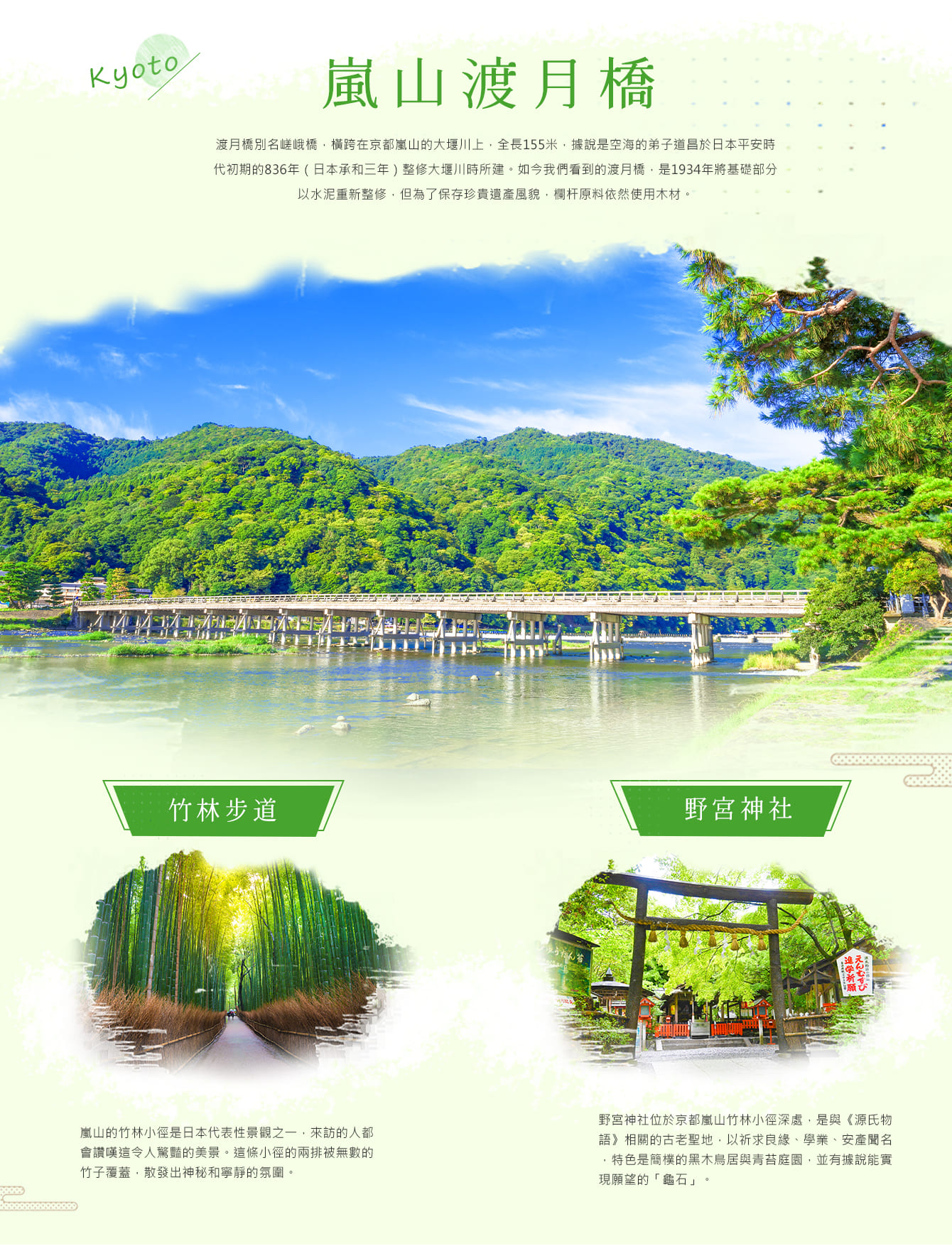 【嵐山渡月橋昔日山天皇因皓月橫空啟發而命名,如今是電影時代劇的熱門景地,橫跨大堰川的渡月橋有著濃郁之傳說色彩,此地的秋色與冬景常是騷人墨客最好的題材,自古即有許多詩歌為之傳頌,此橋長約 200 公尺至今仍然保留著用鋼骨復原的 17 世紀的原有風貌,您可於橋上欣賞嵐山美景,閑靜中盡是畫意。