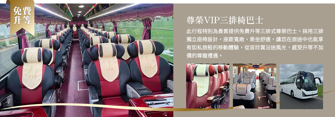 *本行程因車上座位限制,如團體旅客人數超過25人(含),將彈性調整為使用新款45座豪華遊覽車,以確保每位旅客皆享有舒適乘車品質。