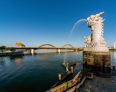 是為了紀念峴港解放38周年,於2009年開始,歷經四年建成,坐落于市區的韓江之上,它不僅是世界上最大鋼鐵結構的龍形大橋,還覆蓋了2500個LED燈,每逢重要節慶的時候,會從龍頭噴出熊熊烈火,除了有代表民族獨立的意涵外,獨特的建築工藝與造型,使它曾登上CNN報導,稱其為峴港城市的新成功象徵。