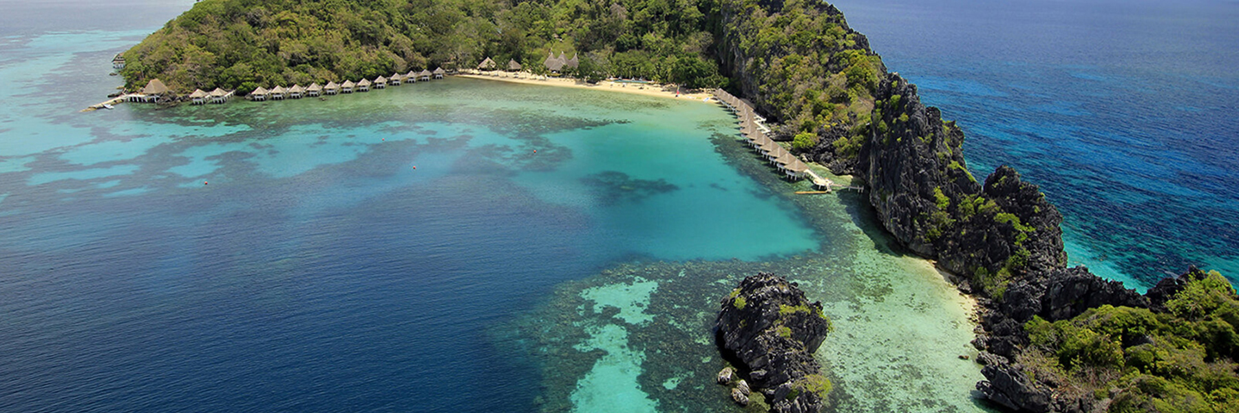 阿普莉度假村,一座座漂亮的白色小屋棲息在巴拉望蔚藍的泰泰灣上,島嶼的周圍被壯觀石灰岩懸崖半包圍著。度假村擁有基本水上屋跟雙層水上屋兩種房型,雙層水上屋的私人陽台連接著樓梯可直接通往大海。不論是哪一種房型都能享受一整片滿滿的海景,24小時感受水色與天光的美好變化。