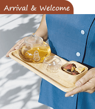 請放下長途跋涉的疲憊,享用一杯清新沁涼的迎賓飲料,服務人員為您介紹水療設施與設計,並且引導您至男女友別的更衣區域,且為您備妥毛巾、拖鞋,之後開始一段全然放鬆的療癒時光。