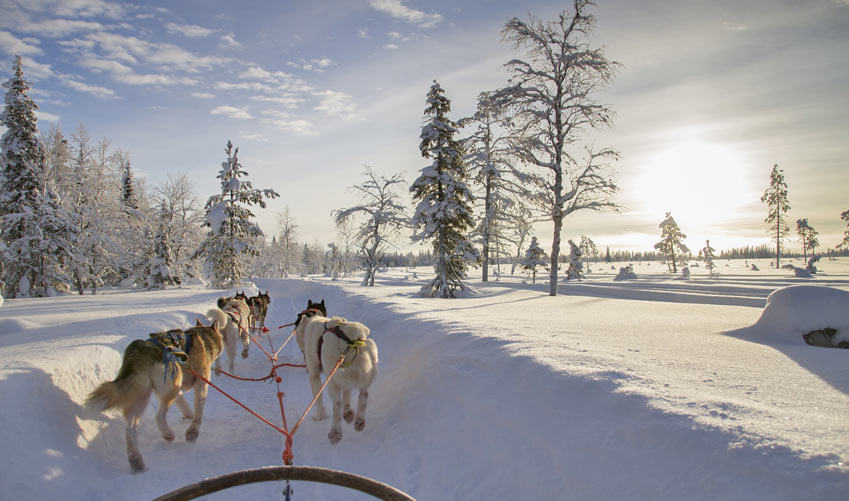 相較於其他相同緯度的地區,芬蘭的氣候較為宜人,境內遍布湖泊與森林野地,深冬雪景優美,造就愛好冬季活動者的運動天堂。在電影中看過太多哈士奇拖著雪橇在白雪上奔馳的畫面,在這裡我們將踏上雪撬,讓可愛的哈士奇載著我們一顆赤子之心奔向原野。