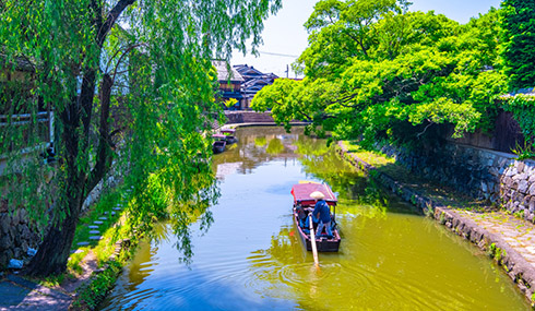 昭和初期之前,八幡堀一直是當地人們經濟和流通要道。運河沿岸,白土牆倉庫及舊時民居林立,講述著當時繁榮景象。八幡堀是一條人工運河,流經近江八幡市 中心,連接了這座城鎮與琵琶湖。想要真正感受八幡堀的魅力,最佳的遊覽方式是乘坐遊船。您只需坐下來、享受夢幻般的氛圍、欣賞沿途優美的風光,並靜心感受歷史美好。