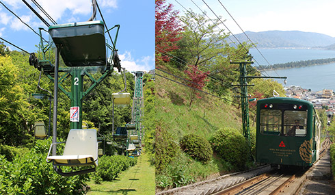 文珠山上有可觀望天橋立的展望台,山上有觀覽車及老少皆宜的遊樂設施。從此處望去的天橋立猶如飛舞上天的龍,因此被稱之為「飛龍觀」,到此可觀看到一番生氣活力的天橋立景色。可選擇乘坐登山吊椅或乘坐單軌電車到展望台。俯視天橋立的絕佳觀景台,可觀賞到天橋立「斜一文字」景觀。用「倒過來看」(彎腰從兩腿之間望向後方的動作)望向天橋立的話,天橋立會像是架在天上的橋一樣。