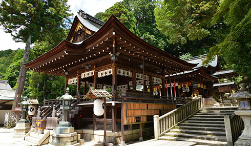 位於八幡山山腳下的日牟禮八幡宮,是一座歷史悠久的神社。八幡宮參道的入口,有一座木造鳥居。這座鳥居的柱子立在台輪上,頂部還有屋頂,造型非常罕見。沿著筆直的參道前行,右側會看到樓門。據說最初建造的樓門上,曾有江戶時代(1603年–1868年)初期著名雕刻家左甚五郎的雕刻。雖然樓門曾經燒毀,但重建後的樓門上依然可以看到龍、鳳凰、鶴、龜等象徵吉祥的雕刻,建議停下腳步細細欣賞。參拜後最受歡迎的御守,是以八幡大神的使者「鴿子」為主題的「鳩守」。據說有避邪、招福、健康運等功效,有粉紅、藍色、黃色三種顏色。附有吸盤、祈求交通安全的申守也很受歡迎。
