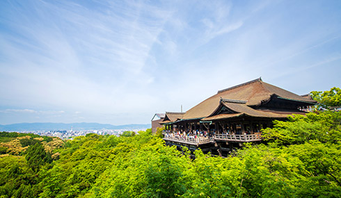 凡到京都必到此一遊,兼具名勝及當地文化風俗的特色,座落於東山的中心,其擁有造型獨特的『清水的舞台』,是一個莊嚴又雄偉的木造結構建築,由巨大的木柱支撐著,從峭壁上伸展出去,在此俯視京都城街,勾勒出千年古都典雅的風貌。
