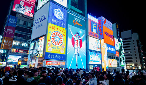 位於戎橋和道頓崛橋之間,霓虹燈光變化從紅、藍、橘到暗紅,代表道頓崛的一天。夜裡五光十色的霓虹燈倒映在河面,只見橋上拍夜景的人爭相尋找最佳的拍照角度。順道前往熱絡有名心齋橋商店街,在充滿了年輕氣息看不到盡頭的商店街,貼心的搭上透明雨遮蓬,無論刮風下雨都不減您逛街購物的興緻,大阪燒、章魚燒、一蘭拉麵、金龍拉麵、0101、H&M、ZARA、UNIQLO、高島屋、大丸百貨琳瑯滿目的商品,人潮不斷,完全感受大阪城市的鮮明氣息和閃亮的活力。而緊鄰隔壁綠樹成蔭的御堂筋大道則林立著多家世界性時尚名牌店。