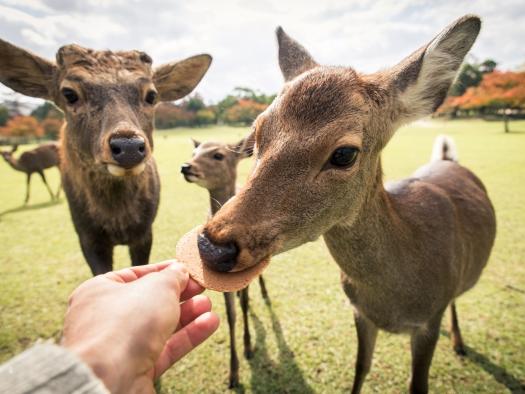 東大寺所在位置即為奈良梅花鹿公園。奈良公園中約有著將近1200頭的野生鹿群,自古以來奈良公園一直為其棲身之所,所以鹿被認為是神的使者而受到人們珍愛,這裡的鹿一點都不怕生。而大佛、綠意、鹿正是古都奈良的表徵。