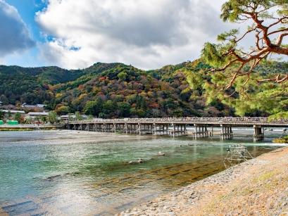 京都最具代表性的觀光名勝「嵐山渡月橋」,四季之春櫻、夏綠、秋楓、冬雪遊人均絡繹不絕,橋下的桂川波光粼粼,水鳥點綴其間,彷若人間仙境!自平安朝起,日本的貴族們就將這一帶做為郊外踏青,泛舟戲水的遊樂地。渡月橋附近景色宜人,青山綠水,料亭紅燈,遊人如織。沿河可偶見盛裝藝妓姍姍而行,風情萬種。