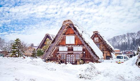 有200~300年前所留的合掌式造作建築,地處豪雪地帶、再加上山區地形阻絕、形成地域獨特的風俗文化,至今仍完整保留為日常生活之用,其中以合掌型的茅草家屋最為著名,為防積雪而建構的急斜面的茅草屋頂,有如兩手合掌的形狀,目前尚有113棟,屋旁田地園圃交錯銜接,構成一幅濃厚懷古幽情、山間農村的田園景觀,於1995年12月聯合國文教組織登錄為世界遺產以來,世界各國的觀光客蜂擁而至,在此地可了解文化歷史背景的來源。