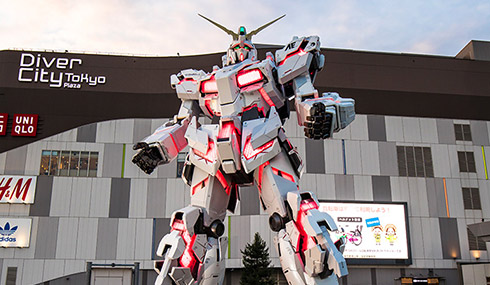 位於東京灣畔的台場 Diver City Tokyo Plaza,是以「劇場式都市空間」為概念的大型購物中心。商場前最吸睛的目標,莫過於 1:1 等身比例的「獨角獸鋼彈」立像,這尊高達 19.7 公尺的巨型機甲不僅是全球鋼彈迷的朝聖地,每日定時的變身表演與夜晚燈光秀更是氣勢磅礡。