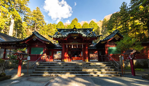 神社最負盛名的絕景,莫過於矗立在蘆之湖中的朱紅色巨大鳥居——「和平鳥居」。這座鳥居在碧藍湖水的映襯下,遠方若隱若現的富士山構成了一幅充滿禪意的絕美畫卷,是旅人必留影的朝聖地。神社境內還有祈求姻緣著名的「九頭龍神社」新宮,據說飲用其泉水能帶來好運。在這裡,您可以沿著湖畔漫步,感受大自然與傳統信仰完美融合的平靜氛圍,深度體驗日本獨有的神道教文化與春日山林的幽靜魅力。