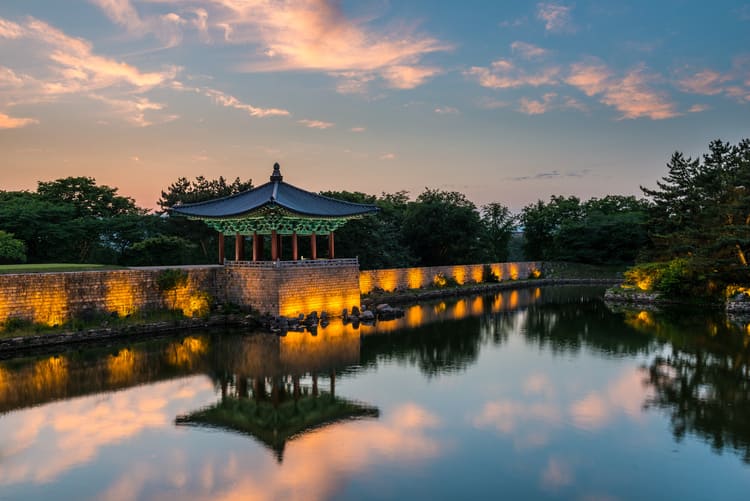 東宮為新羅王朝的離宮,當宮中設宴時,常在此舉行。一旁的雁鴨池取「映月之池」之意,又稱為月池。白天在陽光的照射下,望向波光粼粼的池面,東宮倒影隨著微風的吹拂而動,煞是美麗;夜晚一到,亮黃的燈光讓整個湖面映照著的不只是月色,還有古色古香的東宮,畫面更是萬分動人,讓人忍不住按下快門,只為留住這耀眼的瞬間。