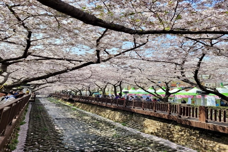 余佐川因MBC電視劇《羅曼史》而聲名大噪,劇中主角初次相遇的橋段,讓這裡被稱為「羅曼史之橋」。此地擁有壯觀櫻花隧道,橋下油菜花盛開,木橋、粉櫻與金黃花海交織成絕美景色。每逢鎮海軍港節,整座城市化為浪漫粉色花海,使鎮海成為韓國最經典的賞櫻勝地。