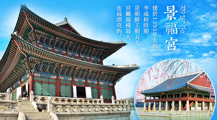 始建於1395年李朝時代的皇宮「景福宮」,共佔地12萬6千坪,內有舉行君王即位大典及文武百官朝禮儀式的“勤政殿“,雄偉而富麗的殿閣,烘托出極盡榮華富貴的氣派,祥瑞之喜鵲飛翔於宮內,那份寧謐令人心曠神怡,有如置身於世外桃源。換上古代傳統的禮服,您可成為最佳男女主角,於景福宮內捕捉美麗的倩影。