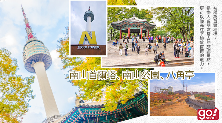 位於首爾市中心的南山公園,樹林繁茂,是個適合散步的好地方。公園內有八角亭和朝鮮時代的烽火臺,以及可俯瞰首爾市區的首爾塔,風景非常優美。1980年起對大眾開放的首爾塔,不僅是首爾市的象徵,更是眺望首爾市區景觀的最佳去處。在首爾塔全新裝潢後,更是擺脫了老舊的外觀,以嶄新的面貌示人。除了表演、展覽和影像設施,並有高級餐廳、咖啡廳入駐,形成一個複合型的文化旅遊空間,如今的首爾塔是到首爾的遊客必遊的一處景點。
