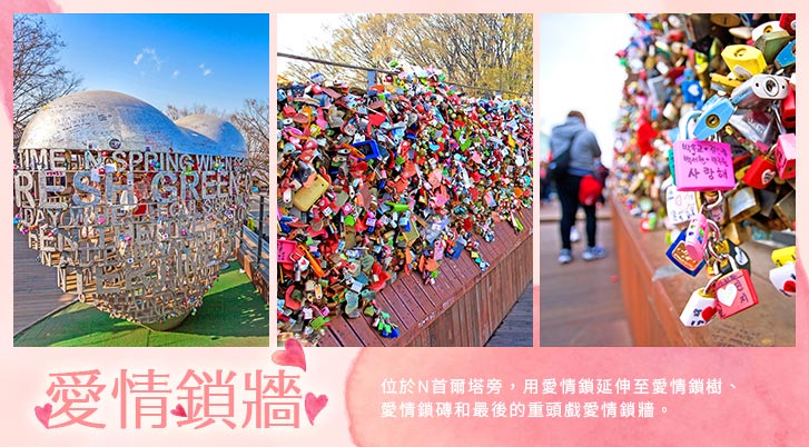 首爾塔旁的鐵絲網,本來是為了保護到南山遊玩的市民安全而設置,但不知道從什麼時候開始,鐵絲網上開始出現一、兩個鎖頭,鎖頭上寫著人名、愛情告白、…等等,並且畫上一顆愛心,而到現在已經有好幾萬個愛情鎖,還成為韓國代表性的愛情景點。