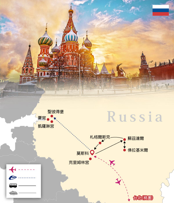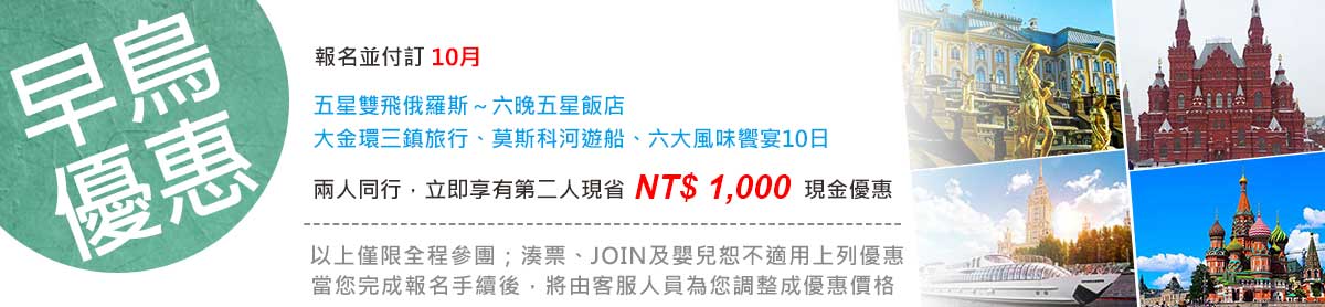 註4:俄羅斯大城市皆容易塞車,景點易受政府影響而臨時關閉,本公司會依保護客人權益為優先考量,視航班及內陸交通狀況,及各博物館的預約時間,調整先後順序。