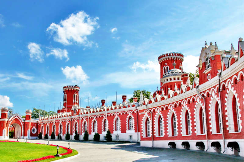 查理津諾莊園:佔地達116公頓,是莫斯科最大的莊園,如童話般的莊園,是莫斯科著名的宮廷建築,建築物全部都以紅磚和白色石刻建造而成。哥德式建築充滿整個浪漫的情調。17世紀時,原名為黑泥地,自然美景逐漸被關注後,開始建立莊園。1775年,女王凱薩琳二世蒞臨時為此優美的山光水色驚艷,下令在此興建行宮,而因改為女皇村。