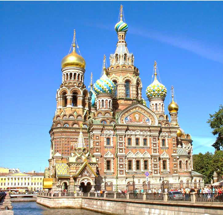 滴血教堂:又名浴血復活大教堂,是亞歷山大三世之子為緬懷他的父親亞歷山大二世於1881年在此地被革命份子投擲炸彈而意外身亡。他公開競選教堂設計圖,最後由帕爾蘭德的設計圖脫穎而出。以莫斯科紅場上的聖巴索大教堂為藍本,外牆運用磁磚及上釉的磚塊以及陶磚鑲嵌成別具特色的馬賽克的風格。