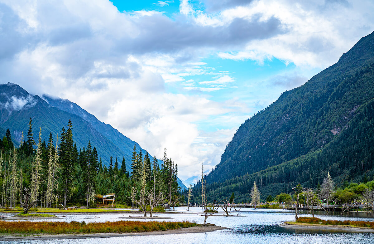 隨後進入雙橋溝景區,沿著谷地深入,雪峰、森林與溪流依序展開,景觀層次隨行程推進而轉換。