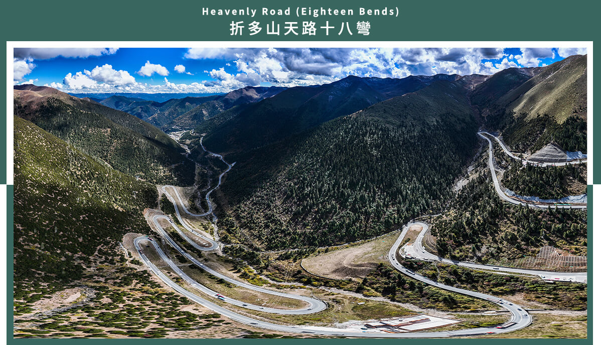 川藏公路(318國道)剪子灣山段的標誌性險道天路十八彎。公路在海拔約4000公尺的山脊上連續盤旋,形成十八個急轉如髮夾的迴形彎,宛如巨龍攀附於懸崖。從觀景台俯瞰,道路線條在雲霧中若隱若現,當車輛在雲霧間逐彎攀升,引擎嘶鳴與經幡翻飛聲交織,彷彿進行一場與天地對話的螺旋儀式。