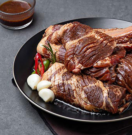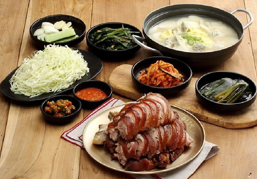 是首爾當地非常有名的美食,以其獨特的香氣與軟 Q 口感而聞名。豬腳經過長時間的燉煮,將肥肉部分的油膩感去除,只留下軟嫩的膠質,口感彈牙,充滿了香醇的滷汁風味。搭配切成薄片的蒜片、新鮮生菜和特製醬料一起享用,更能襯托出豬腳的美味,清爽解膩。