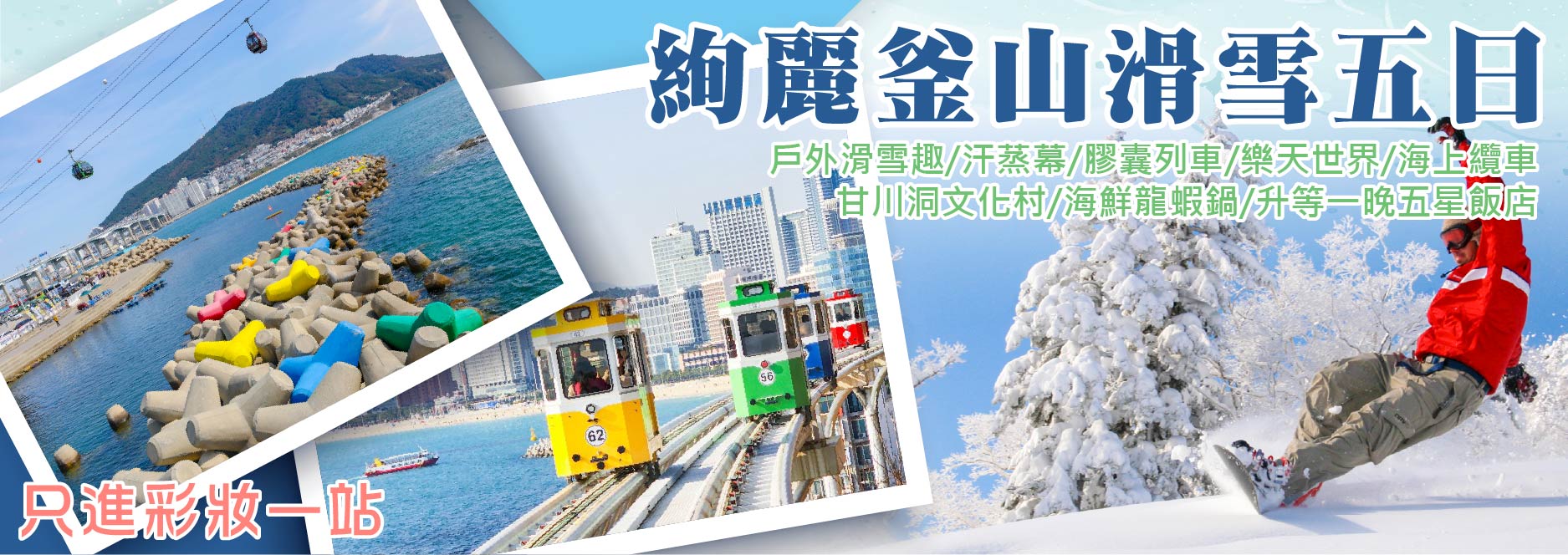 **戶外滑雪趣/汗蒸幕/膠囊列車/樂天世界/海上纜車/甘川洞文化村/海鮮龍蝦鍋/升等一晚五星飯店