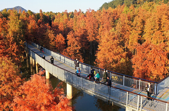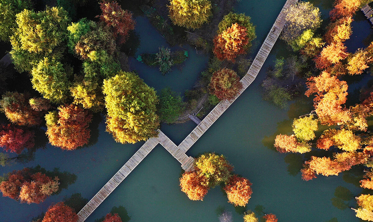 【青山湖水上森林】位於杭州市臨安區,是中國內罕見的水中杉林奇觀。上百畝池杉與落羽杉扎根於碧水之中,秋季變色時紅黃交織,倒映如油畫。可乘皮划艇穿梭林間,或行走於8公里長的架空綠道,感受「樹在水中長,船在林間行」的夢幻意境。冬季水霧瀰漫時,宛如北國霧凇移居江南,成為長三角新晉生態地標。