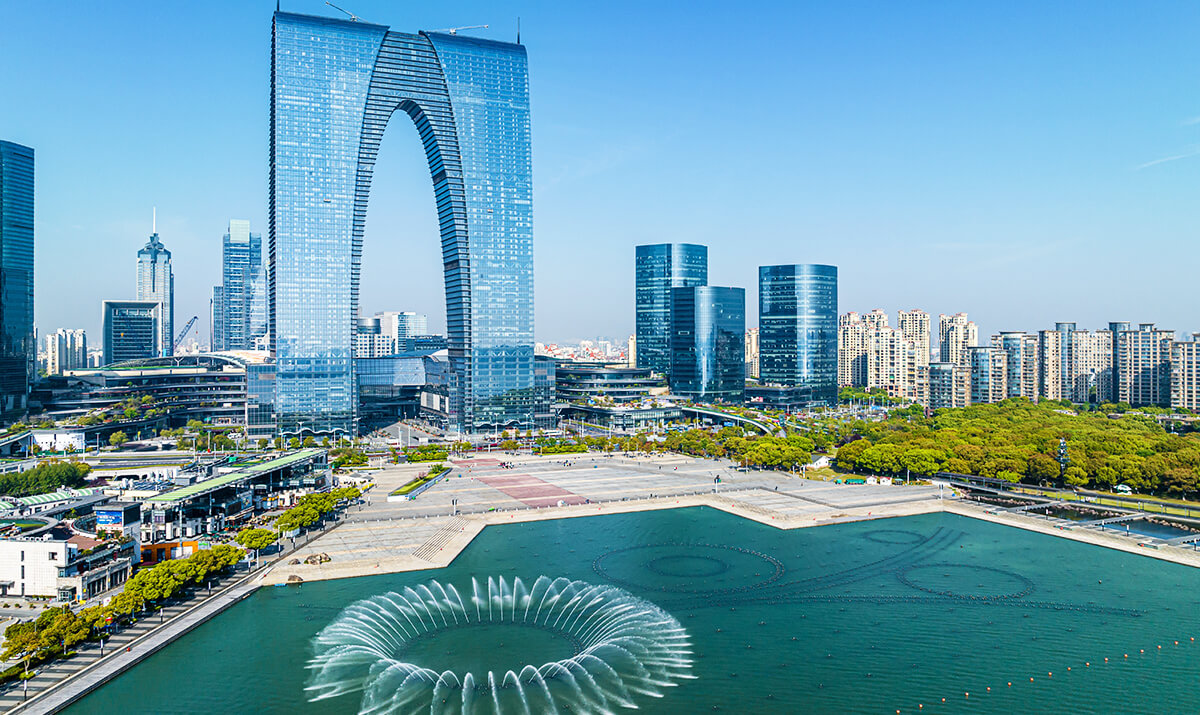 位於蘇州工業園區的金雞湖景區『 是中國最大內城湖泊之一 』也是展現蘇州現代風貌的窗口。白天,湖畔環繞著購物中心、文化廣場與休閒步道,旅人可輕鬆感受城市的悠閒氣息;入夜後,湖面倒映著摩天大樓的燈火,湖心噴泉與水幕表演更添浪漫氛圍。