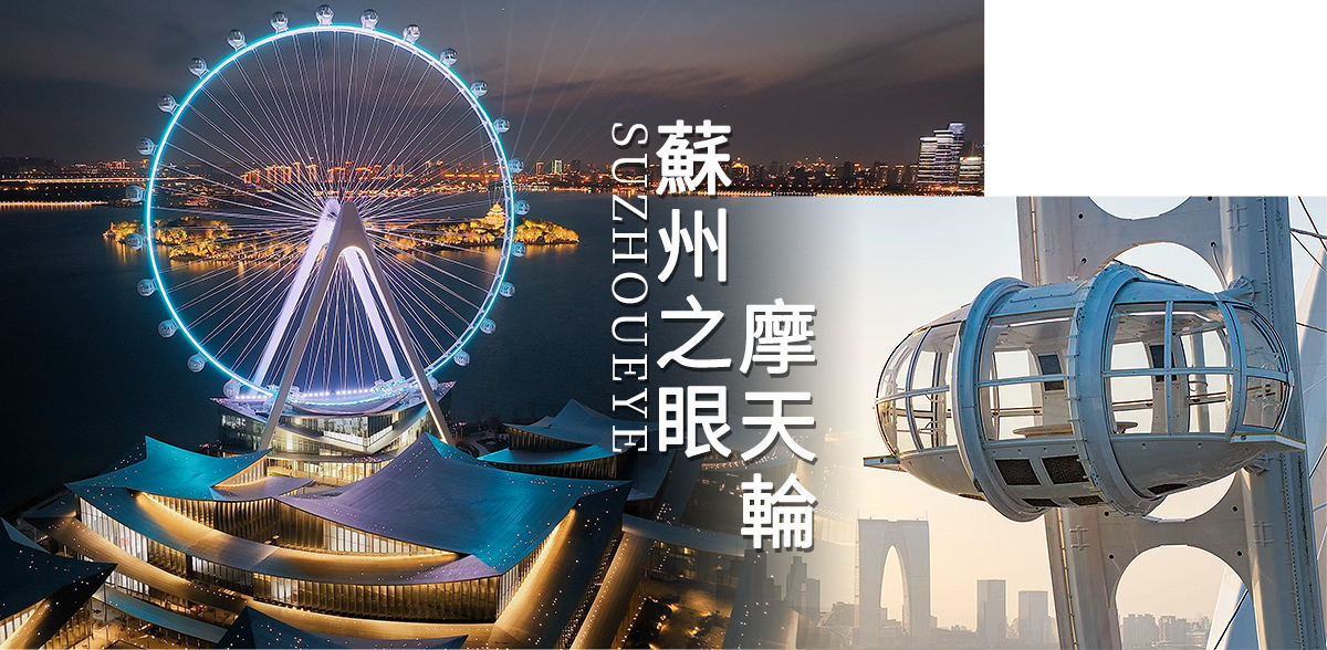 【蘇州之眼】矗立於中國江蘇省蘇州市金雞湖東岸,是一座高達120米的巨型摩天輪,為中國最大的水上摩天輪。28個空調轎廂可360度俯瞰金雞湖全景與蘇州工業園區天際線,夜間燈光變幻如炫彩鑽戒,旋轉一圈約25分鐘,成為現代蘇州的浪漫地標,譽為「華東最浪漫摩天輪」。