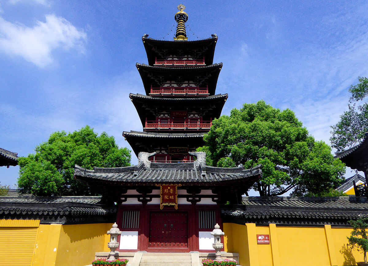 【寒山寺】始建於南朝梁天監年間(502-519年),因唐代詩僧寒山子曾駐錫而得名。這座千年古剎以張繼《楓橋夜泊》中「夜半鐘聲到客船」的詩句聞名遐邇,現存建築為清代重建。寺內古鐘、碑廊與黃牆黛瓦相映成趣,唐代「夜鐘」儀式仍延續至今。大雄寶殿供奉釋迦牟尼與寒山、拾得塑像,院內《楓橋夜泊》詩碑為俞樾手書,被譽為「吳中第一勝跡」,是蘇州佛教文化與詩詞美學的經典象徵。